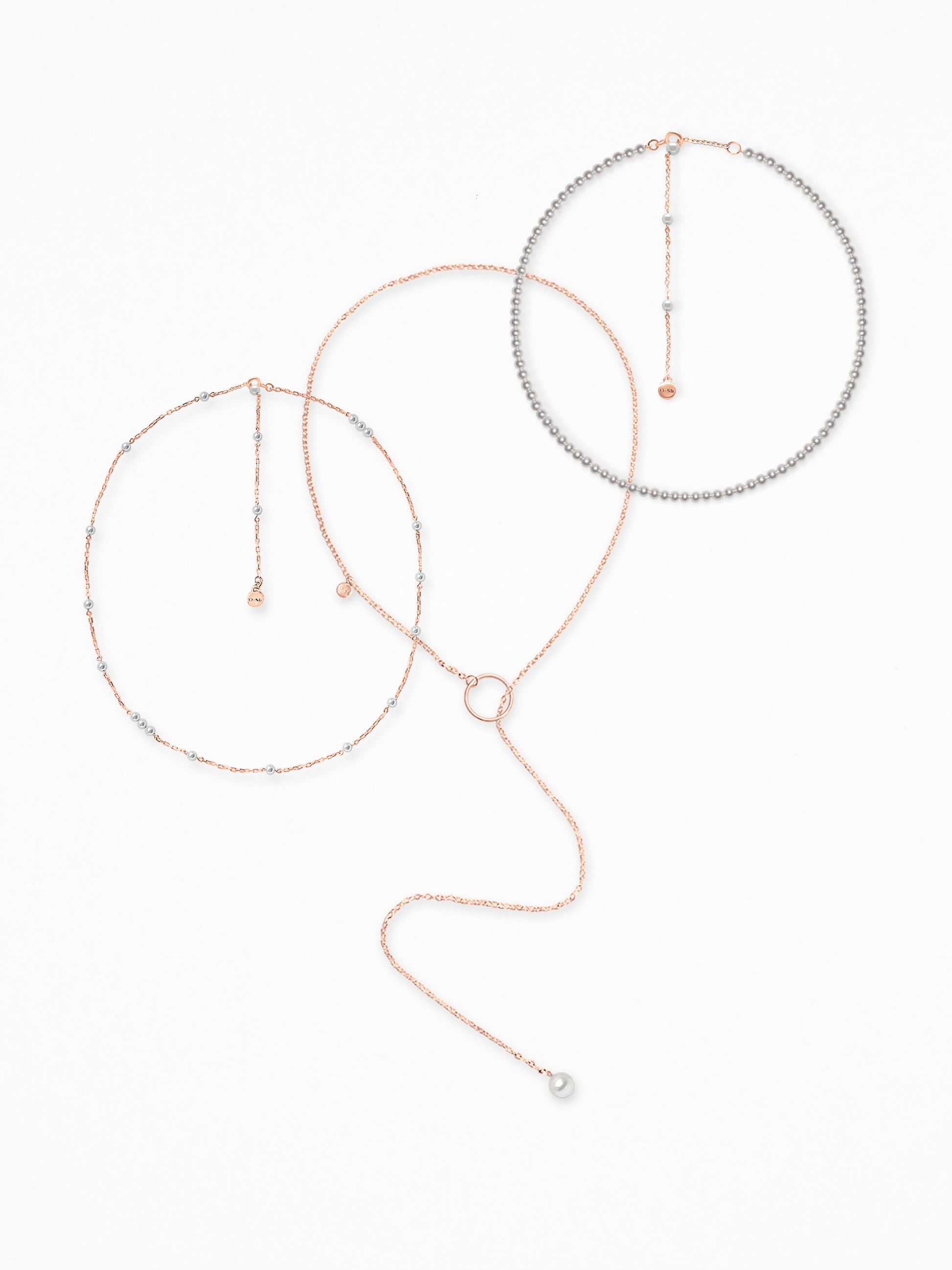 Dreiteiliges Set: zwei Halsketten + Perlen-Choker, aus Vermeil (925 Silber mit Roségold-Beschichtung) und Süßwasserperlen.