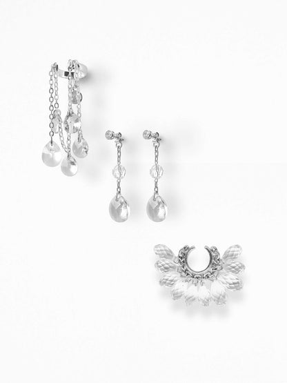 Silbernes Ohr-Set: „GLIMMERLY“ Ohrringe + „GLIMMERLY“ Ohrklemme + „NAKED CRYSTALS“ Ohrklemme.